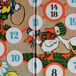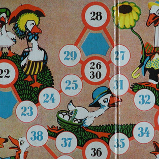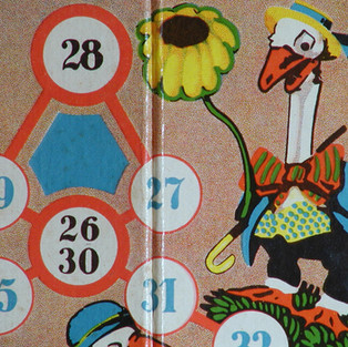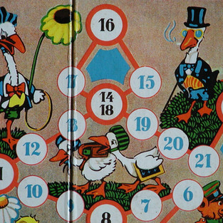 Das Deckelbild ist eher natürlich gestaltet, das Spielbrett jedoch sehr grell und bunt.