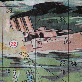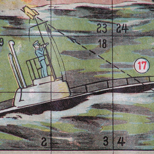 Dass als Leiterspiel ausgelegte U Boot Spiel von Klee zeigt auf dem Spielbrett einen typisch gezeichneten Kriegsschauplatz kurz nach dem 1. Weltkrieg.